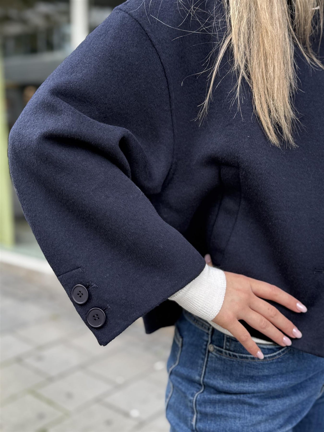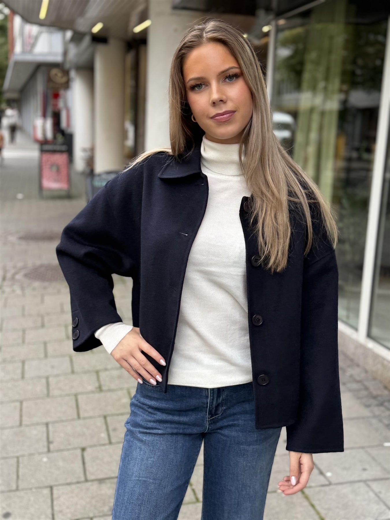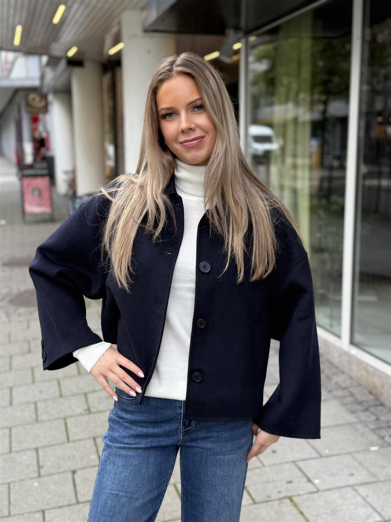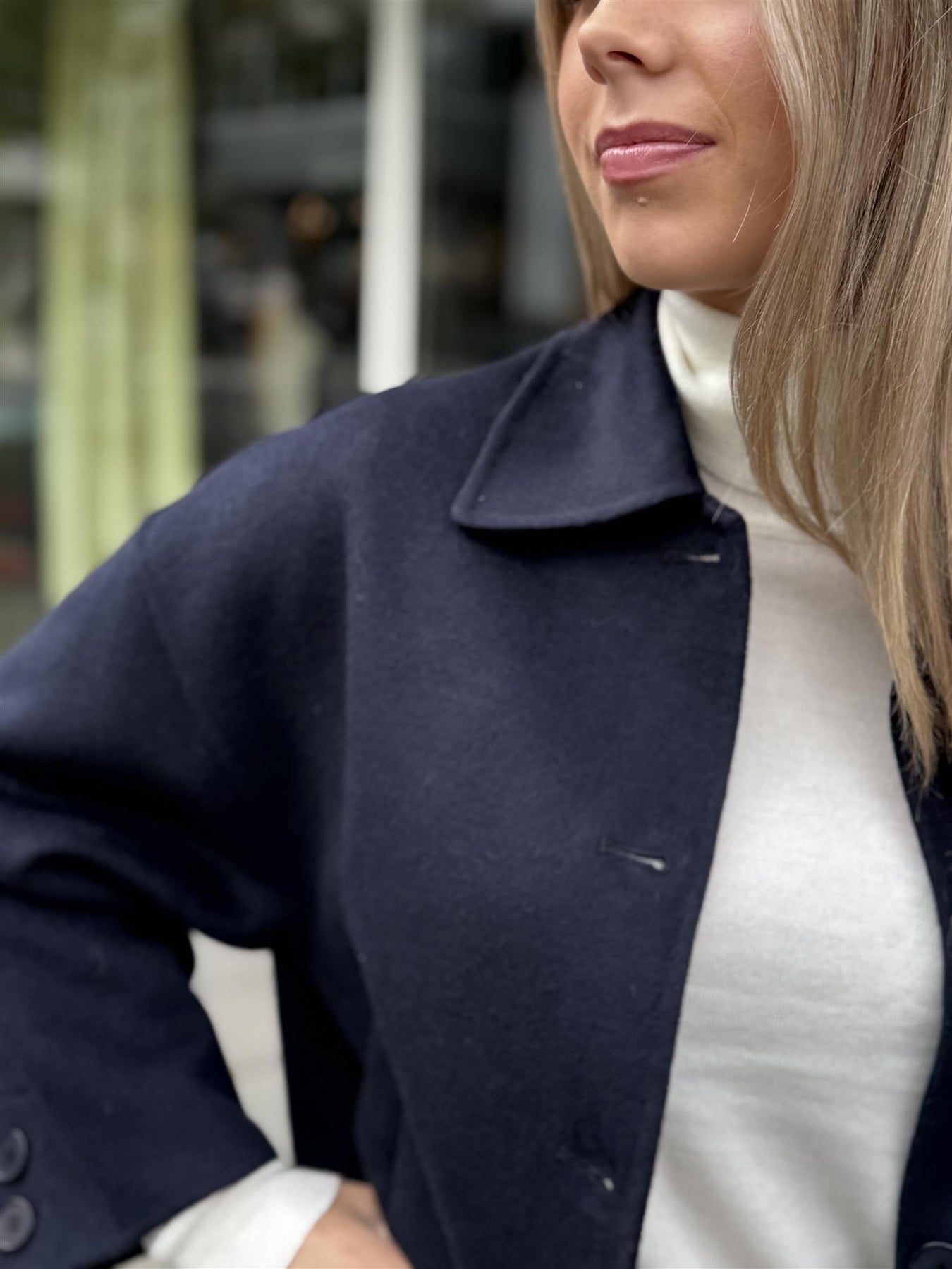 En nydelig kort ulljakke med krage og knepping helt ned i front. Jakken har vide rette ermer og lommer i front.