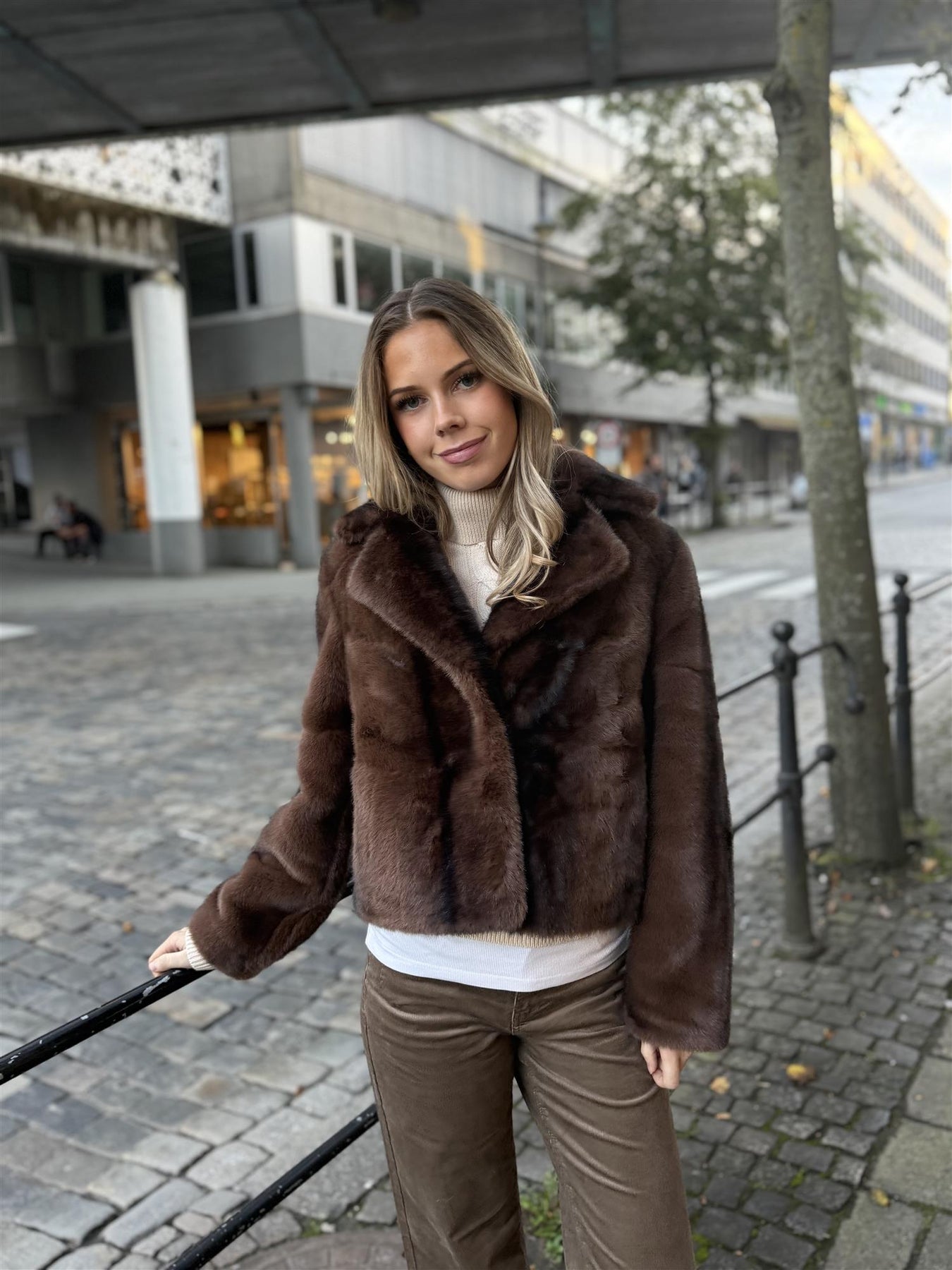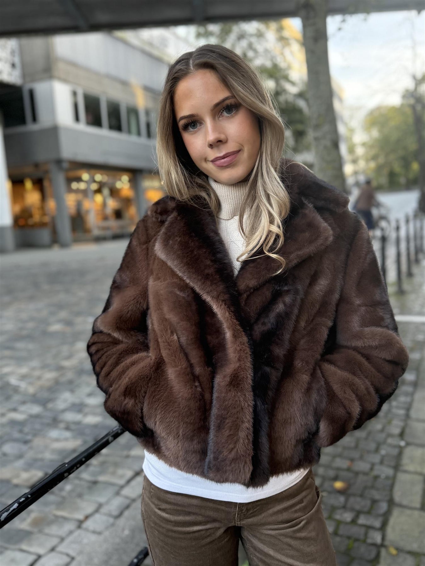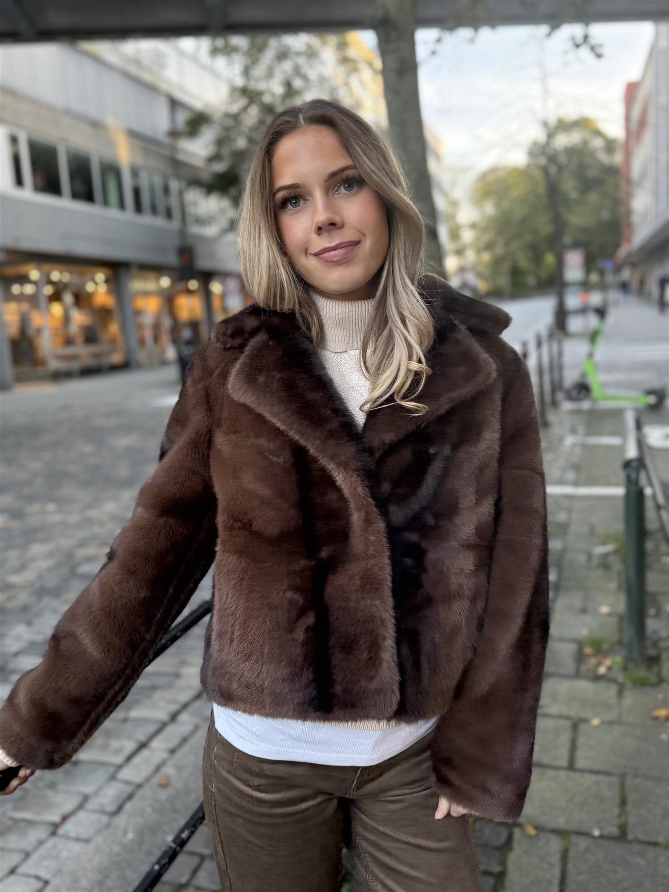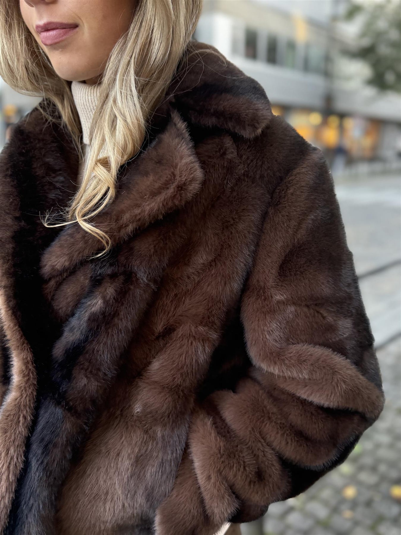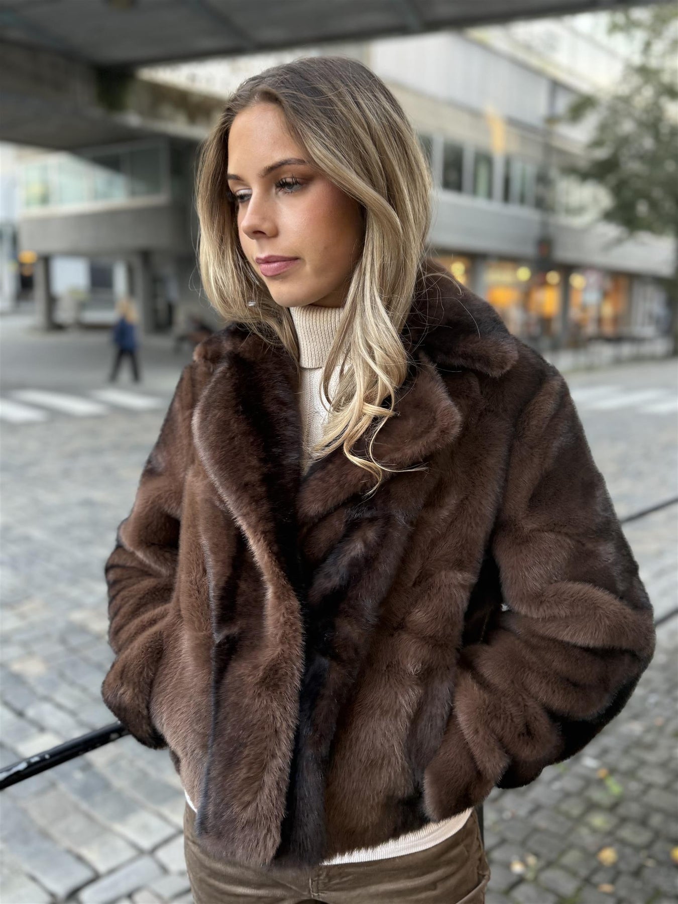 Fuskepels jakke med krage og lukkes med hemper. Lommer i sidene. Kort, rett modell