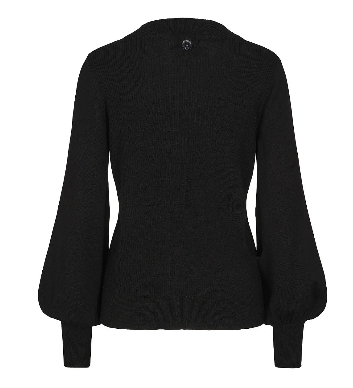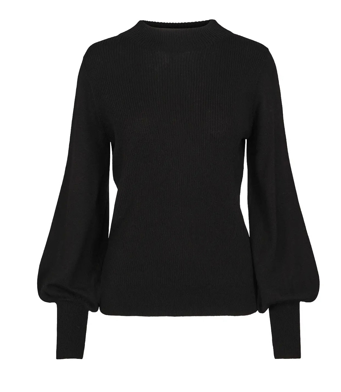 En myk, tynn merinoull genser som er ribbestrikket på kroppen og glattstrikk på ermene. Den har en liten, høy hals, og vidde i ermene. Så denne kan du også pynte opp et antrekk.