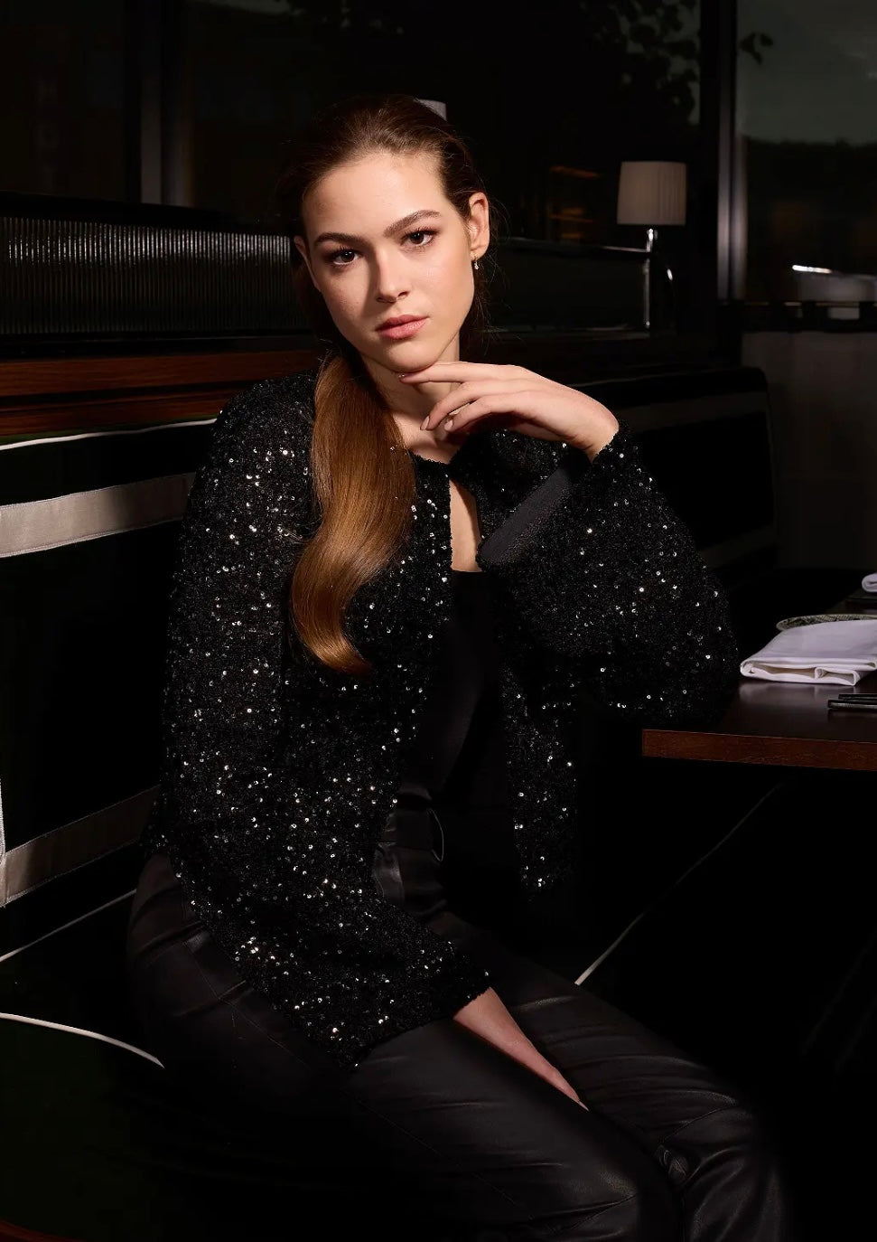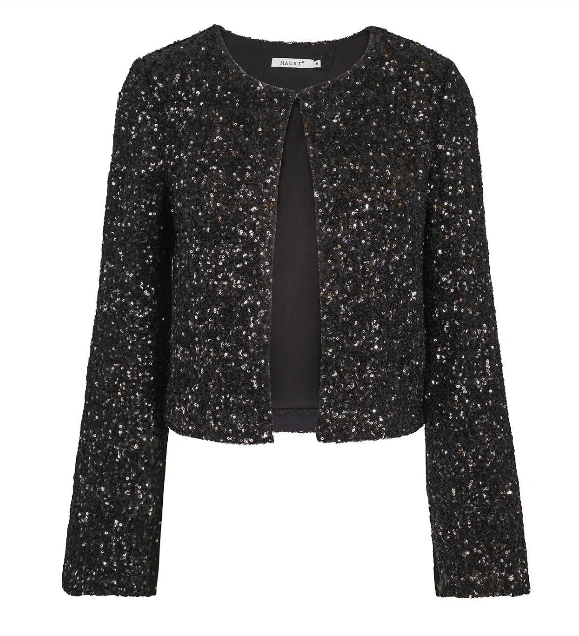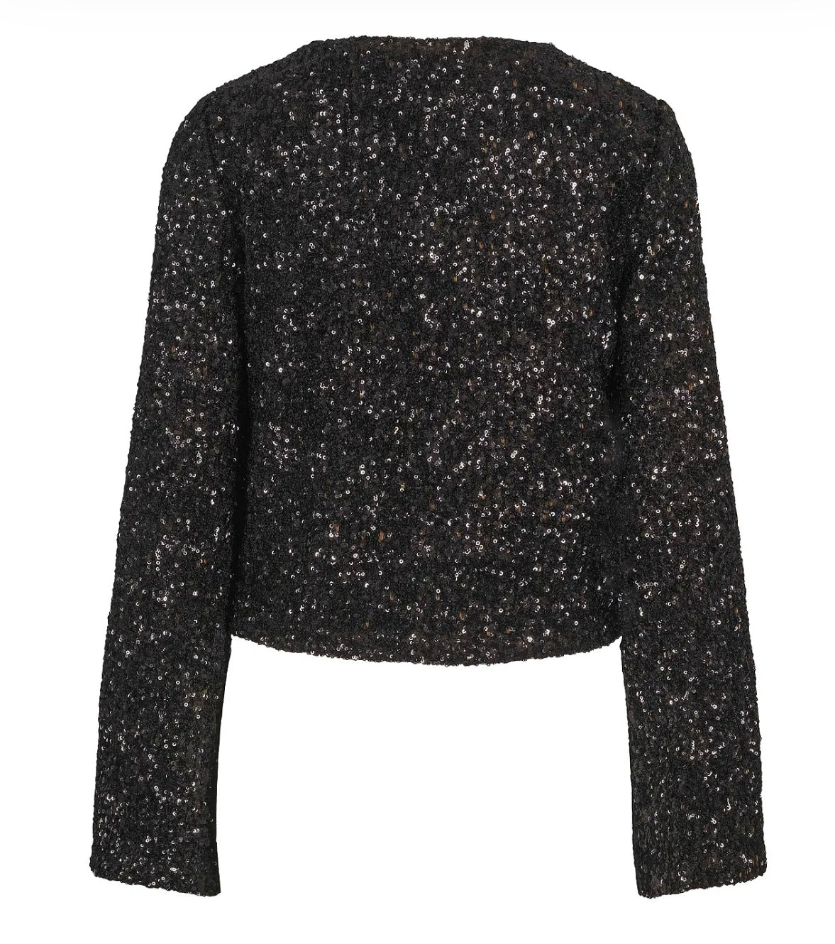 En glitrende og paljett jakke som setter prikken over i-en på et festantrekk. Jakken har en feminin passform med rund hals og delikat knepping øverst på brystet. Denne passer perfekt over en enkel kjole eller til bukse for å lage et mer festlig antrekk.