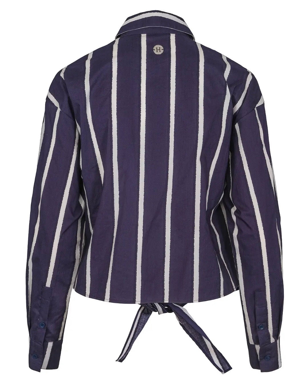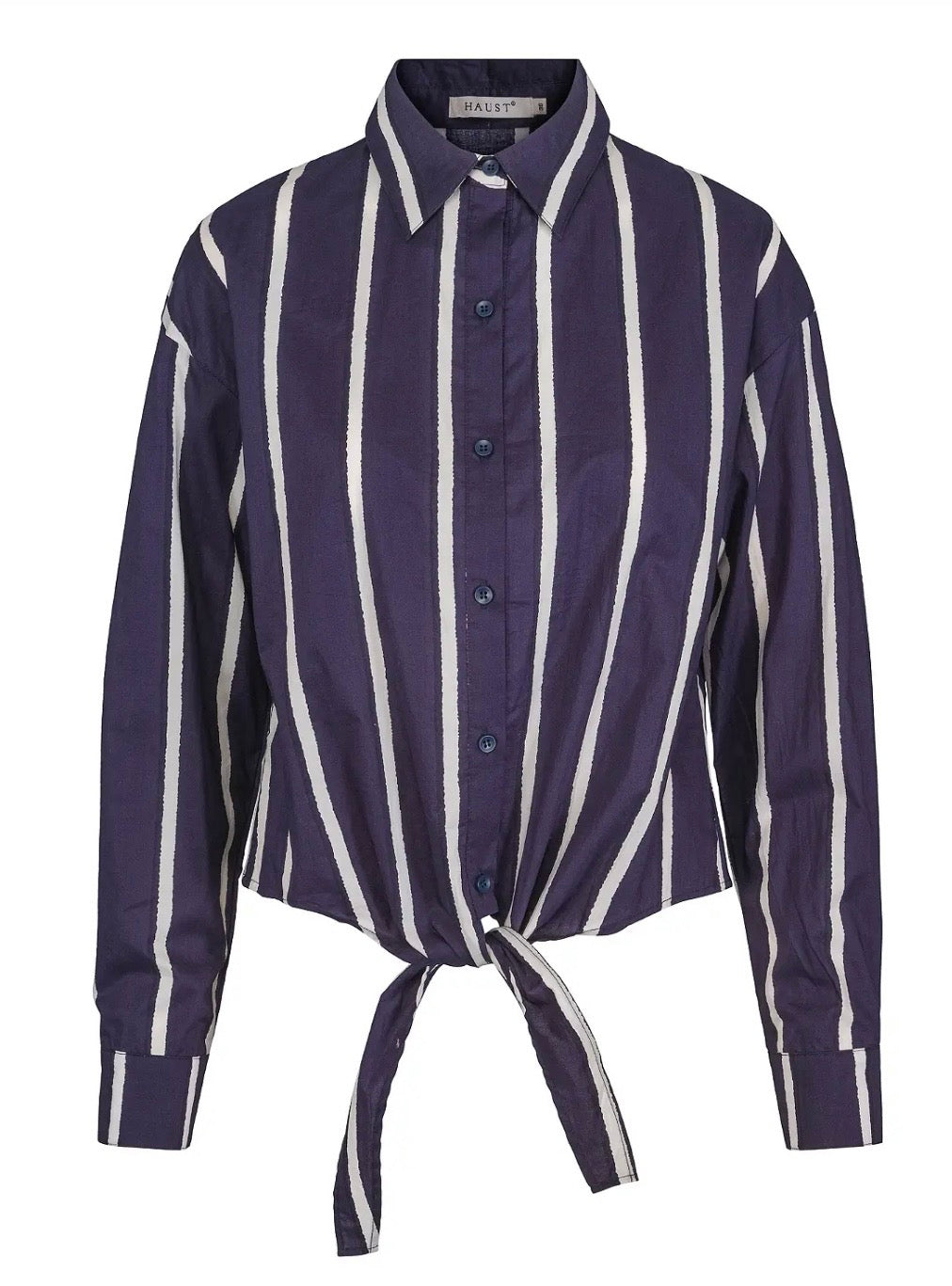 Stilig bomulls skjorte med lange ermer, klassisk krage, knapping i front og knytting nederst som gir den et feminint uttrykk. Passer også perfekt til lange skjørt og bukser med vidde.
