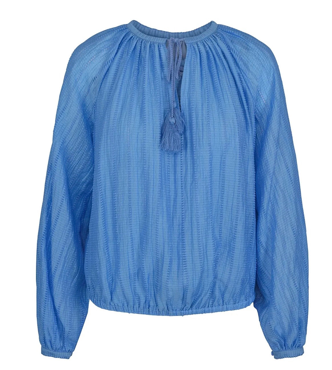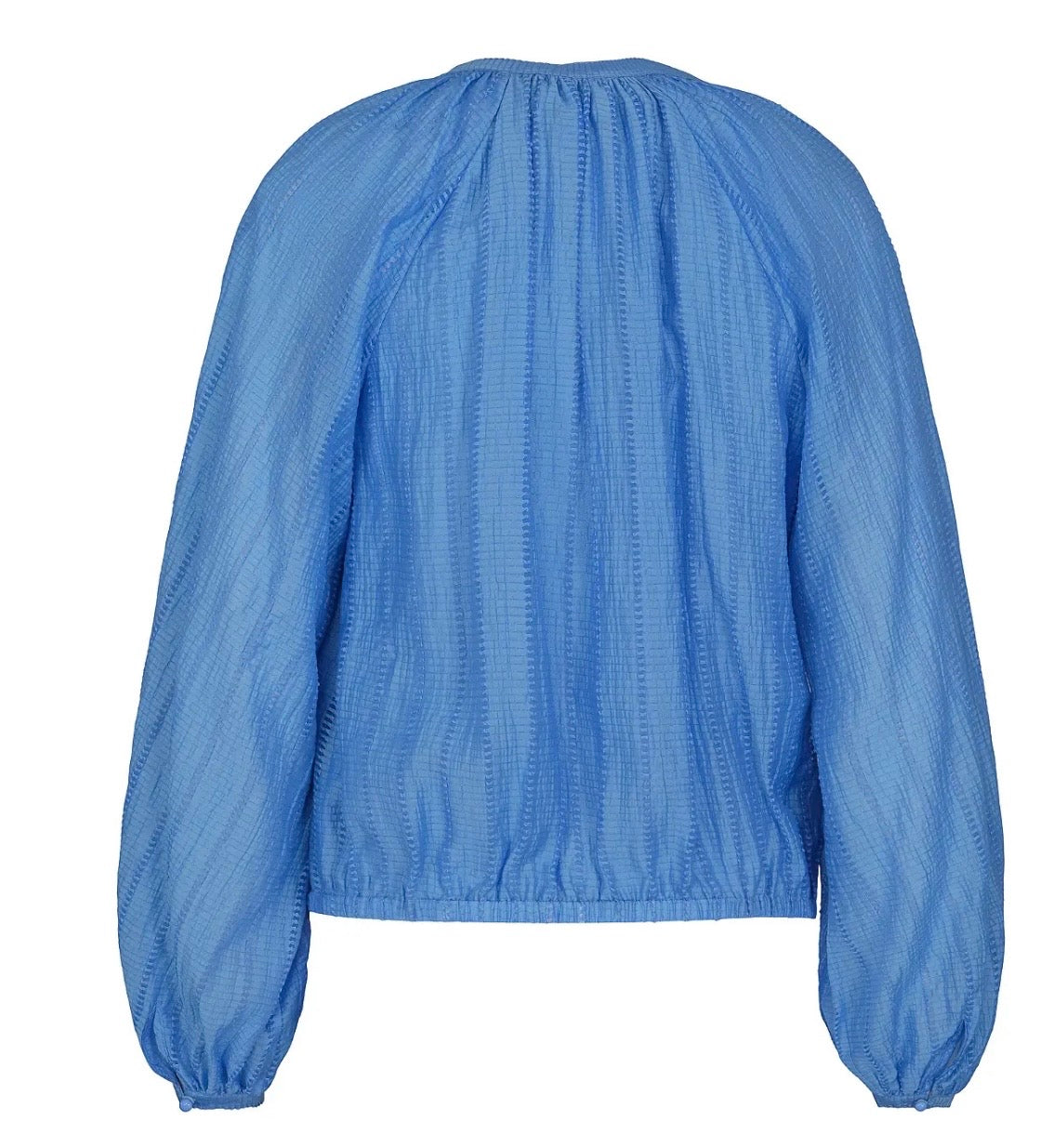 Herlig bluse med struktur i stoffet, knytting i halsen og lange voluminøse ermer. Blusen har strikk kant nederst og en liten linning nederst på ermene som lukkes med en knapp.