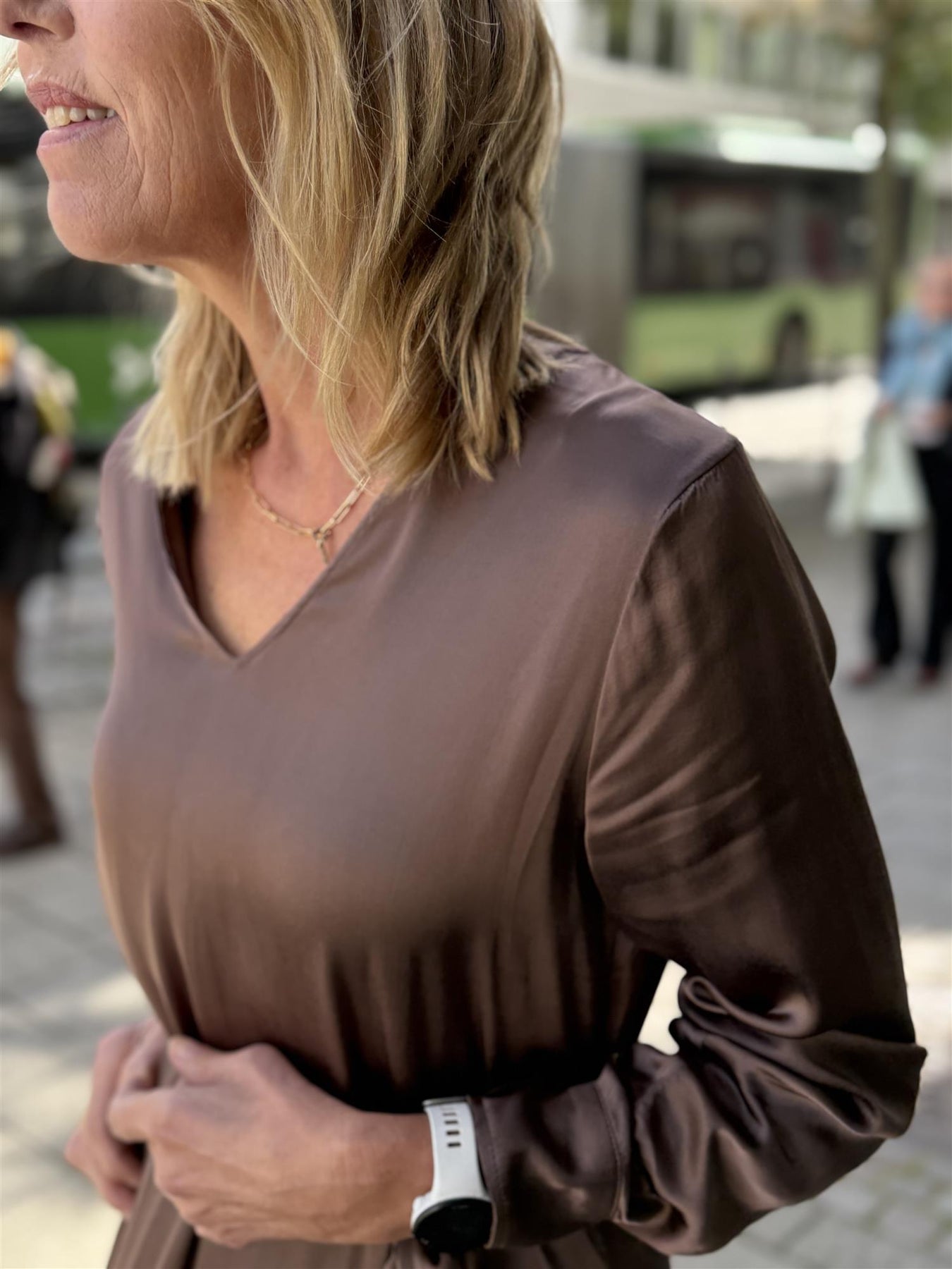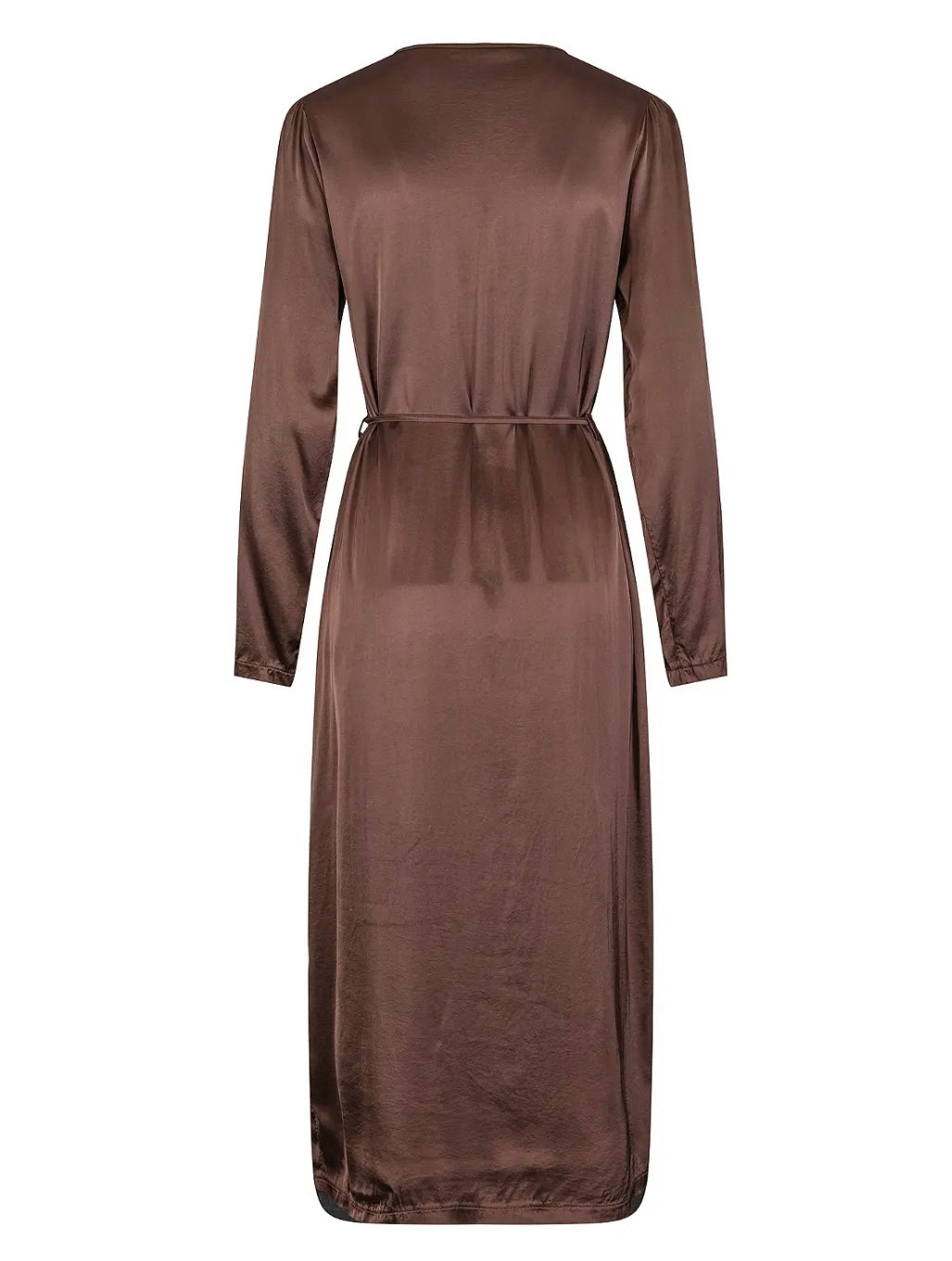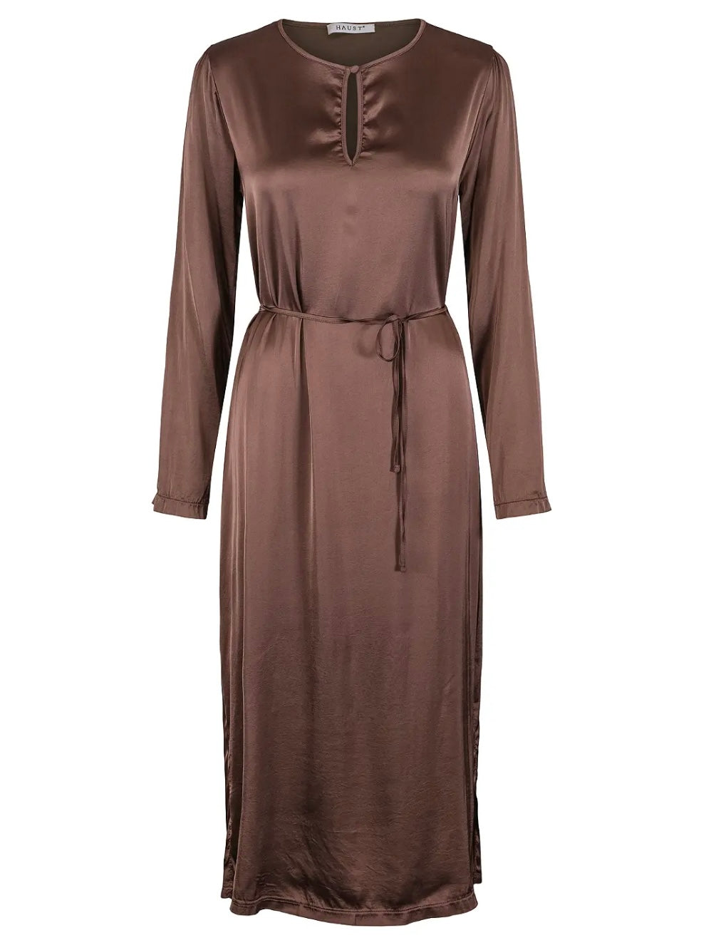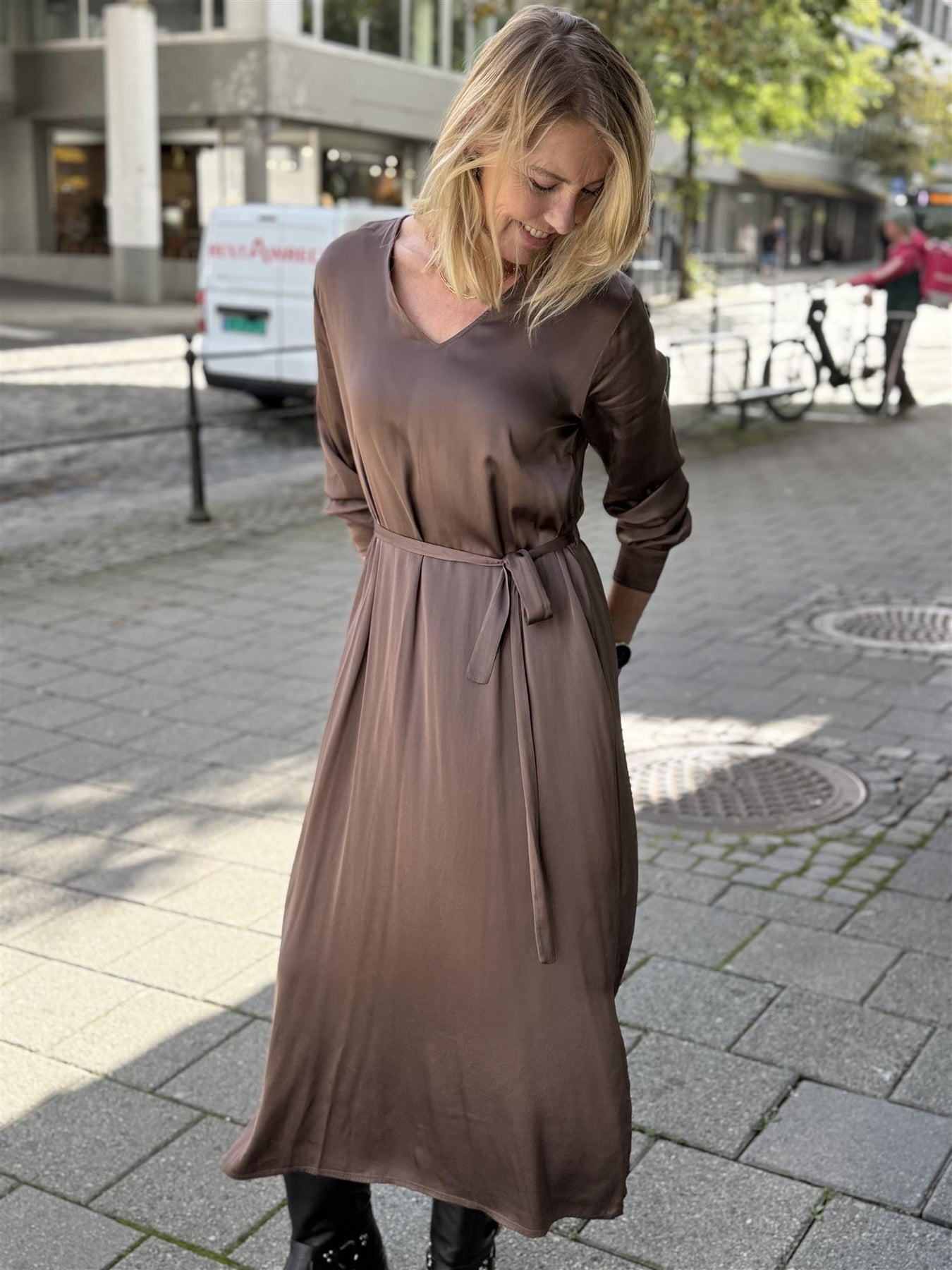 Nydelig lang kjole med lange ermer, rund hals og knytebelte i livet. Kjolen har en blank overflate, og er derfor like fin til jobb som en festlig anledning. Dette er en klassisk model som er like fin å ta frem år etter år, og er derfor et perfekt plagg i enhver garderobe. Lukkes og åpnes i halsen med en knapp.