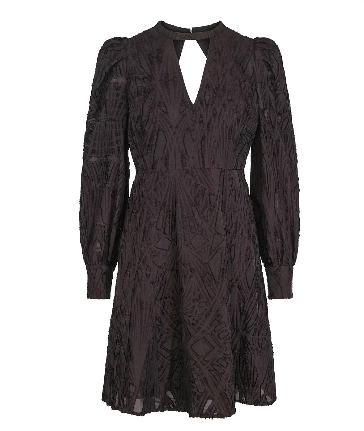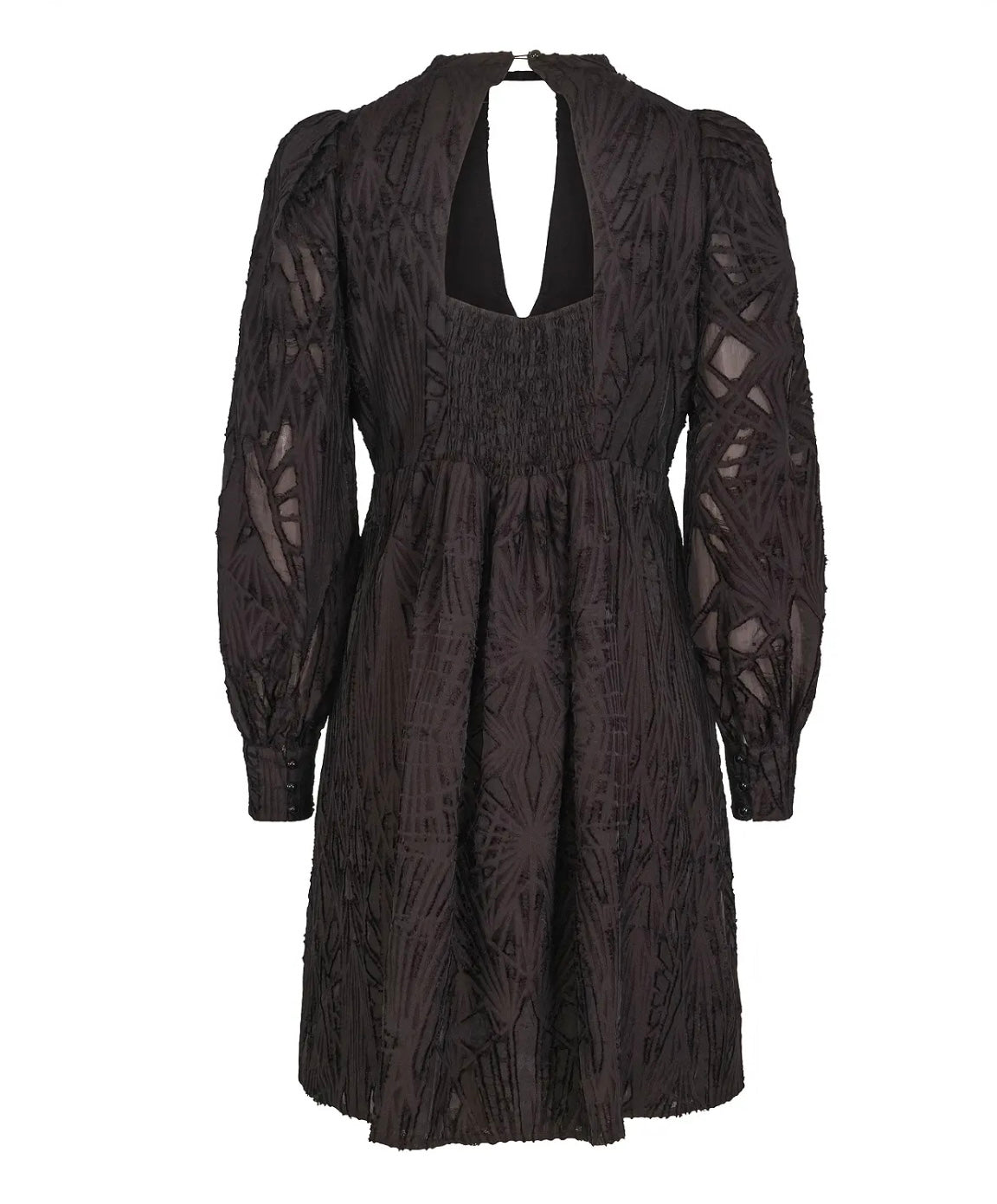 Nydelig kjole med nydelig print i velour som ligger på utsiden. En delikat v-utrigning, lange ermer med puff på skuldrene, lett innsvinget i livet og en bred strikk bak i ryggen som gjør at den sitter perfekt på. Kjolen er foret.