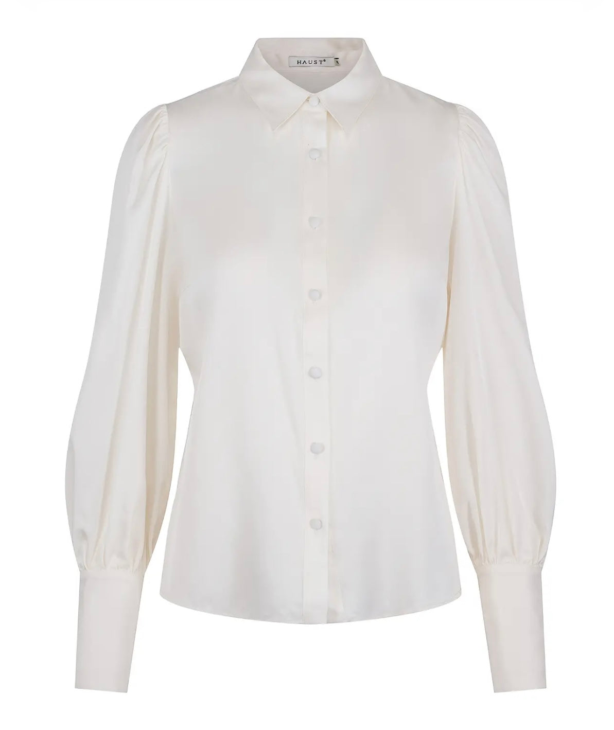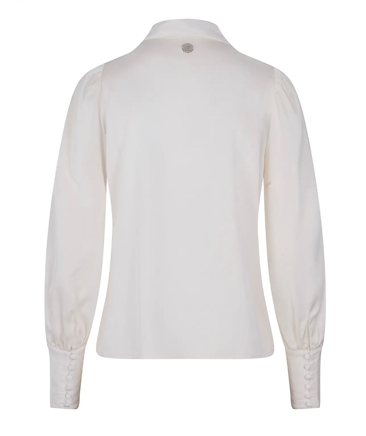 En elegant bluse i myk silke med en liten krage og knappestolpe foran. Blusen har lett puffermer med smale mansjetter, som gir et feminint og sofisikert uttrykk. Stoffet har en glansfull overflate og en behagelig strech som gir god komfort.