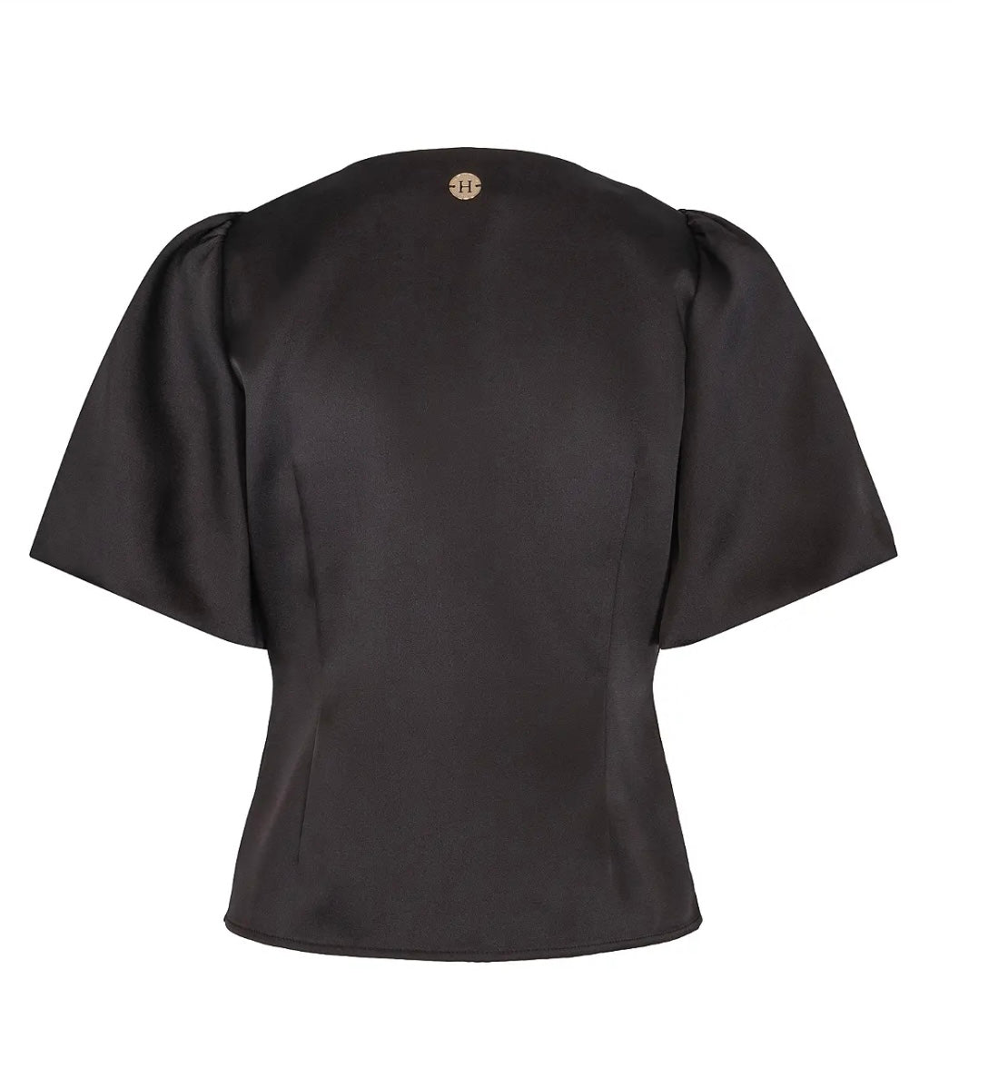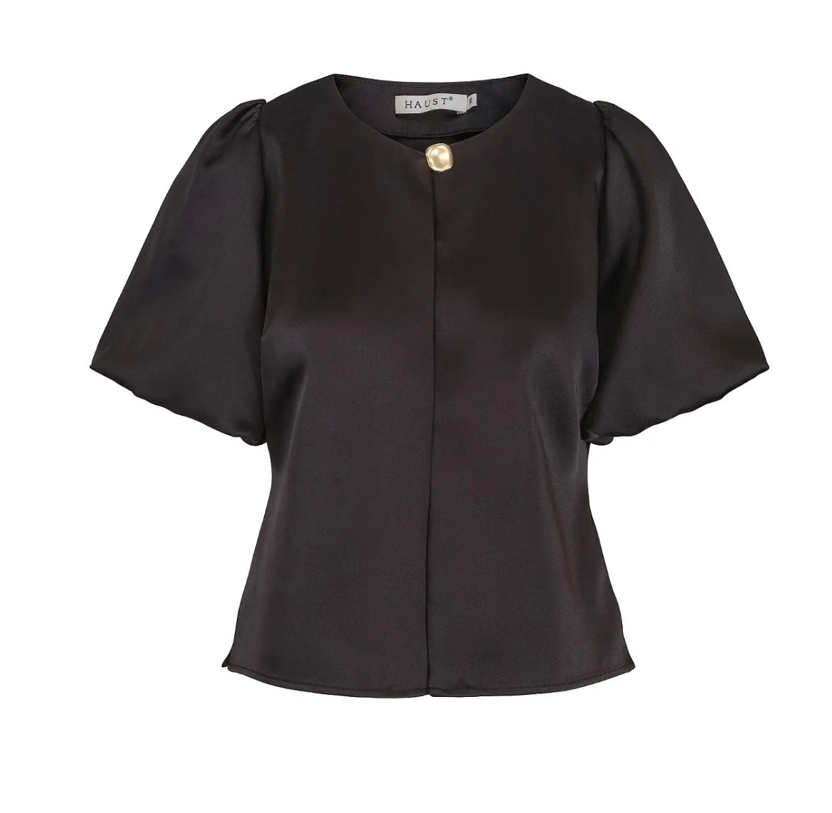 Denne blusen er et must-have for både hverdagsbruk og fest. Den har rund hals og lukkes i front med skjulte hemper. Den har en smal og innsvinget silhuett. Korte voluminøse ermer og en liten puff på skuldrene.