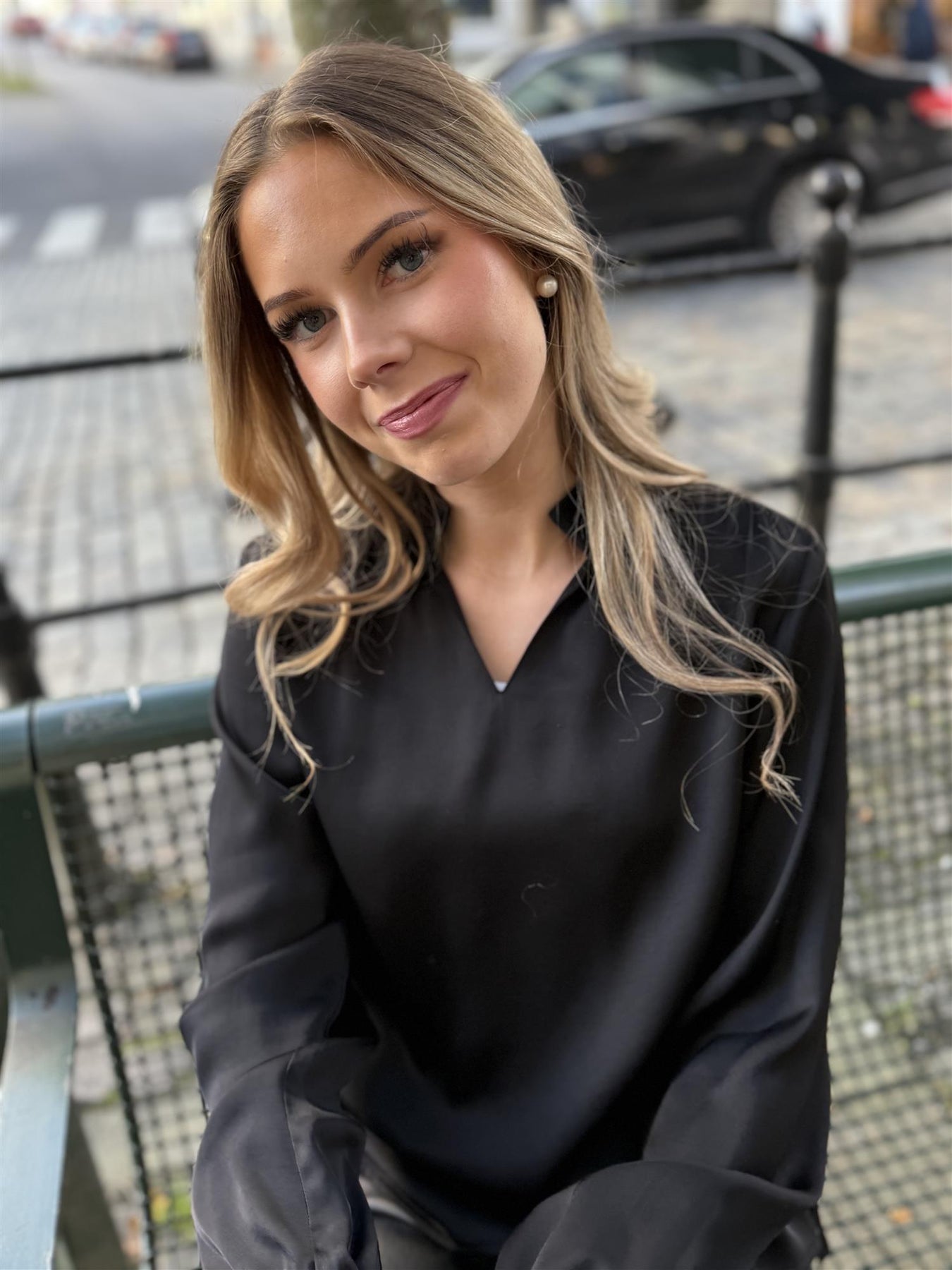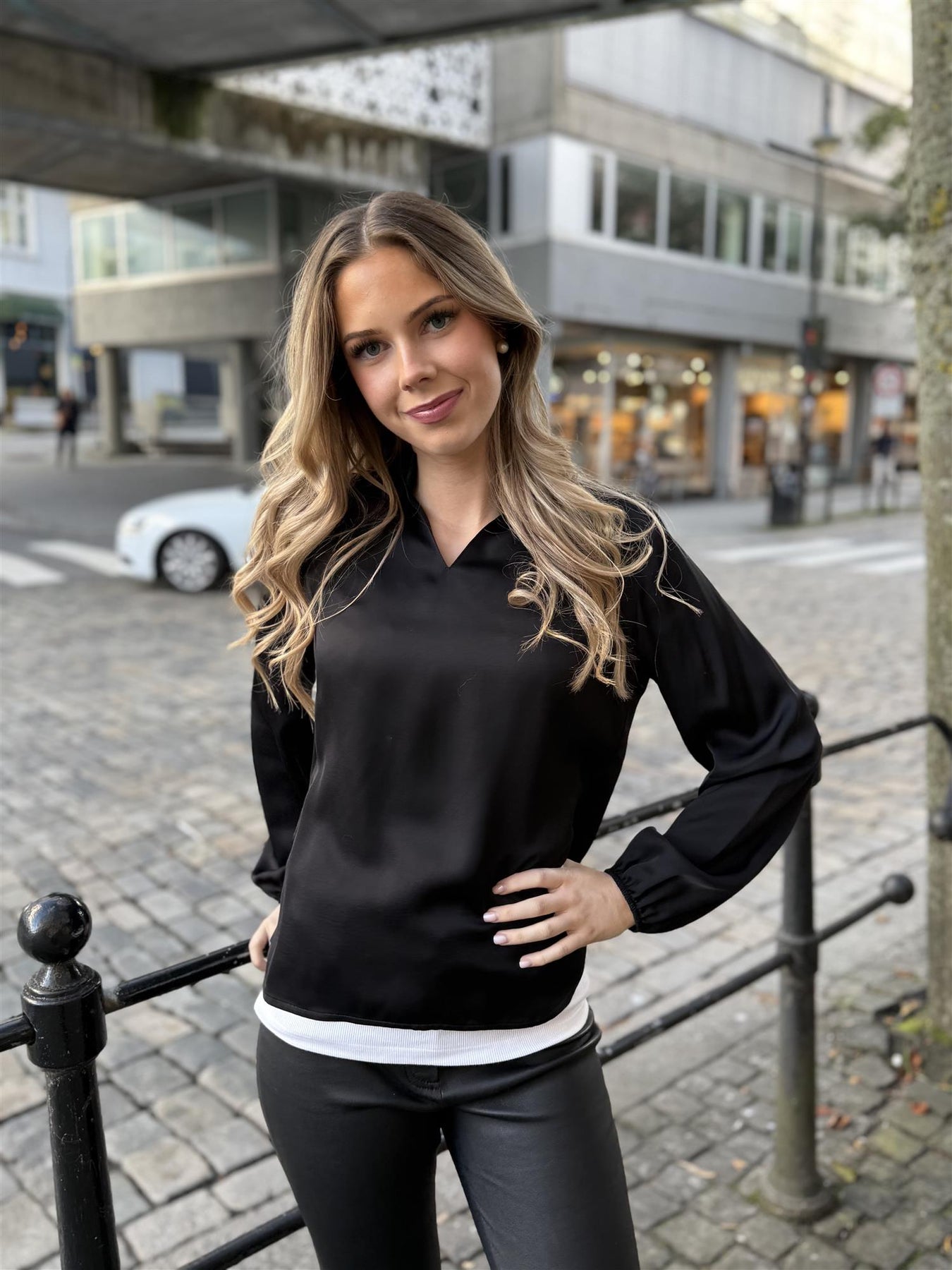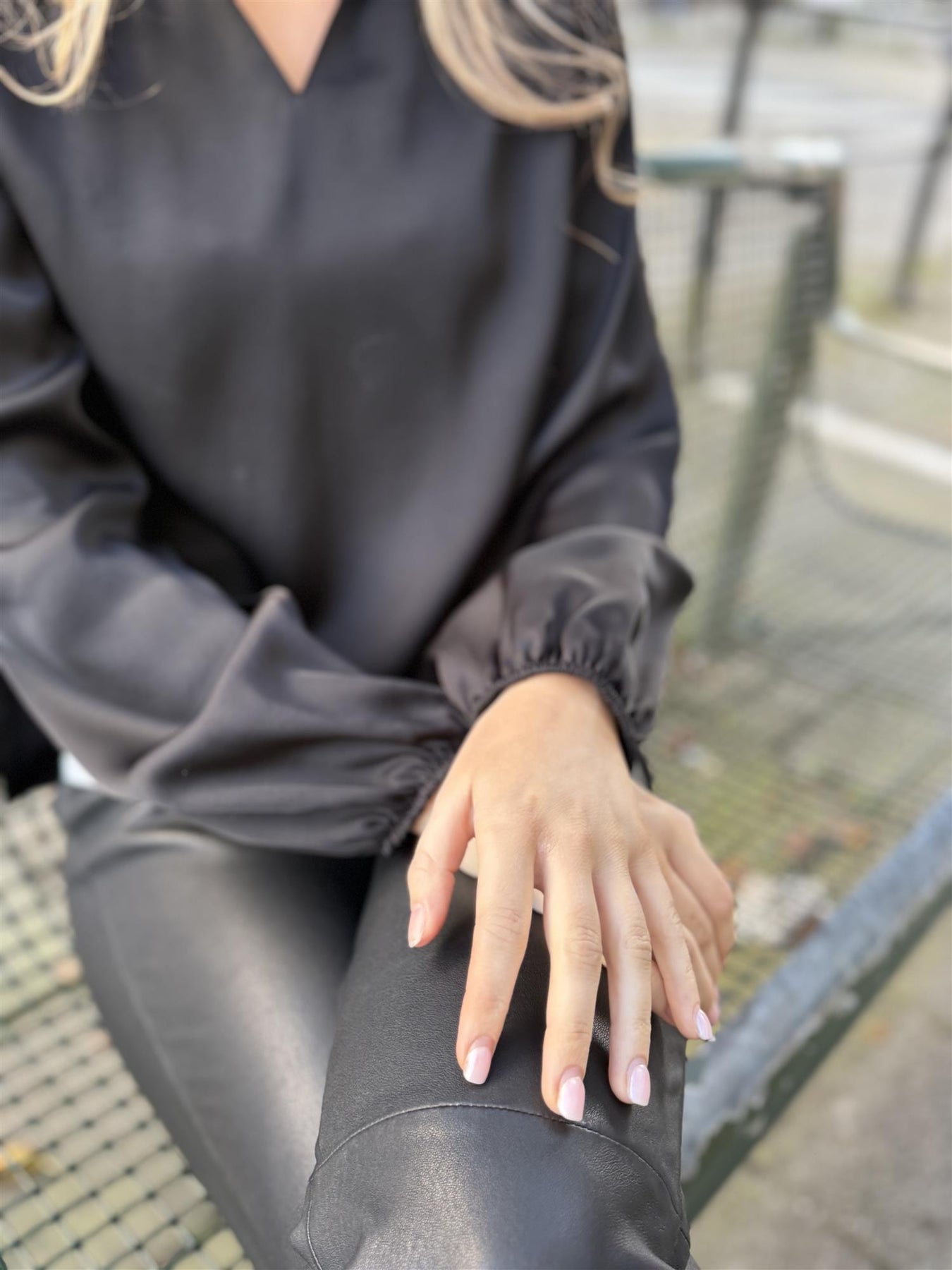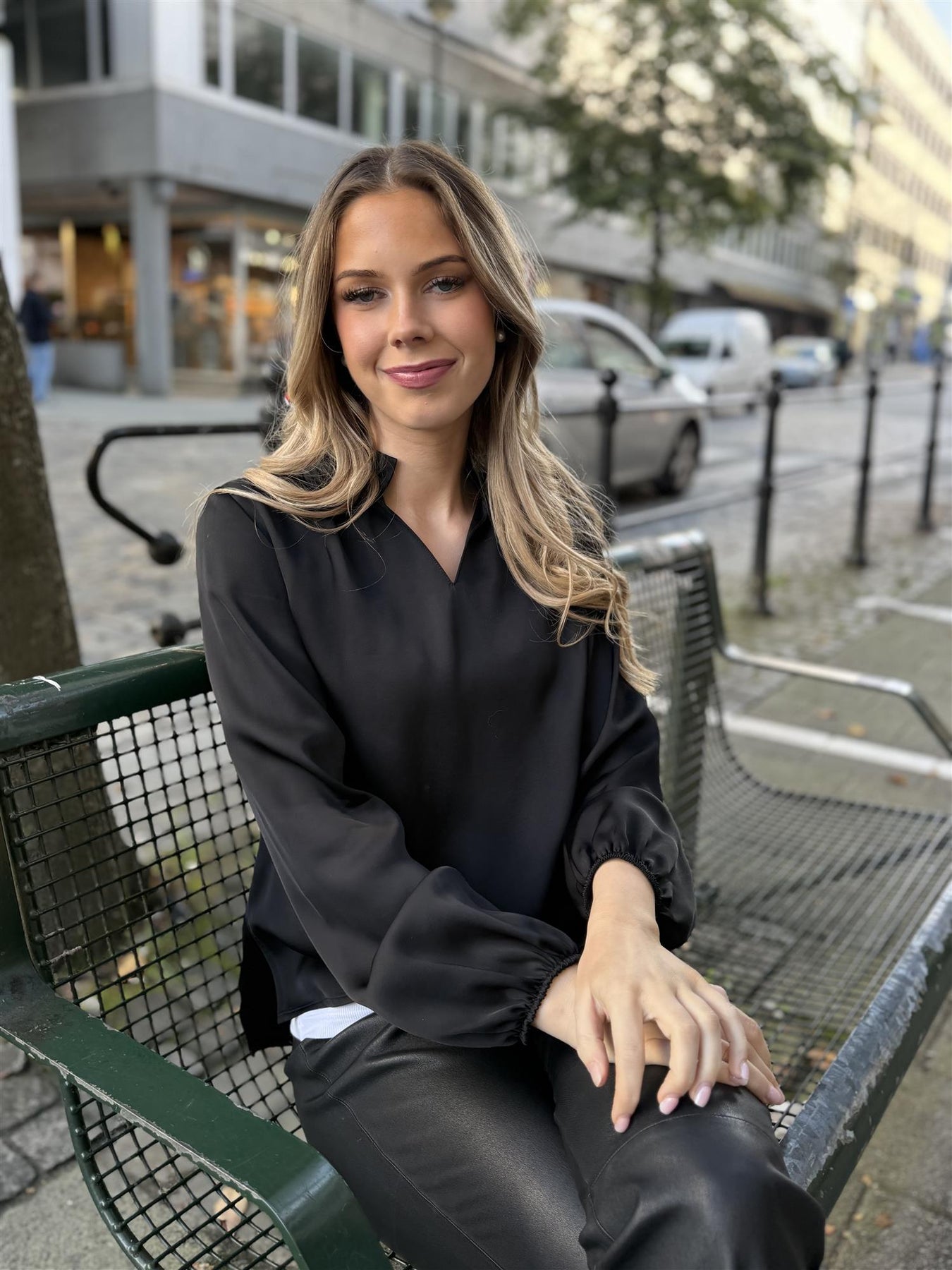 Nydelig bluse med delikat v-utrigning og lange ermer med strikk nederst i nydelig viskose kvalitet.