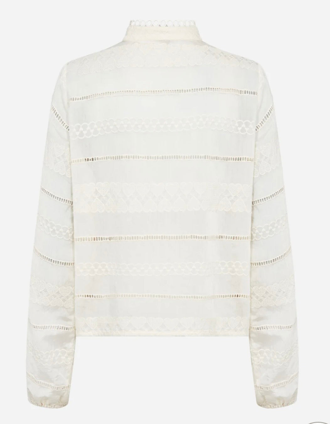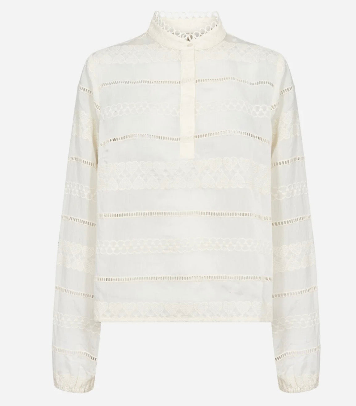 Nydelig bluse med delikate broderier. Blusen har rund hals med blonde og kneppestolpe foran i front. Den har lange ermer med strikk nederst. Rett i modellen.