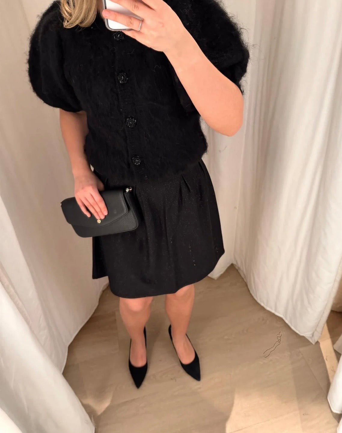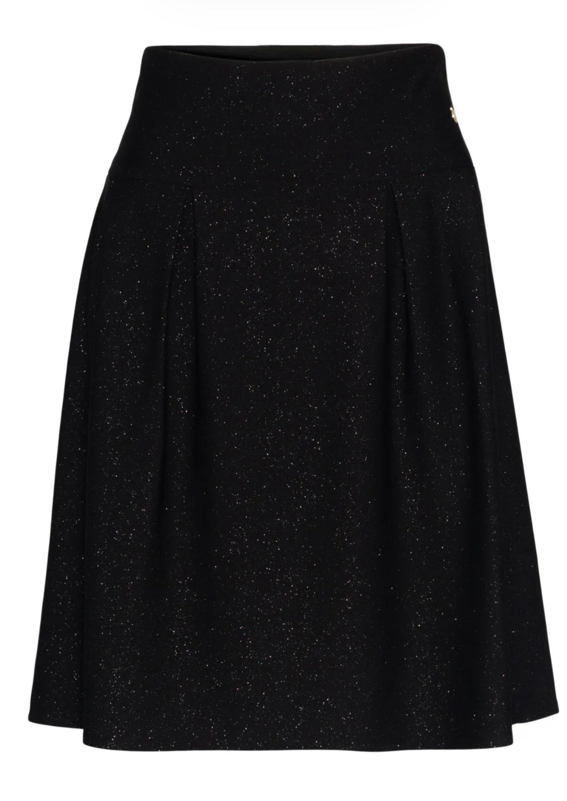 Elegant skjørt med glitter i en myk strechy viskosemiks. Skjørtet har en bred kant i livet og små legg i front.