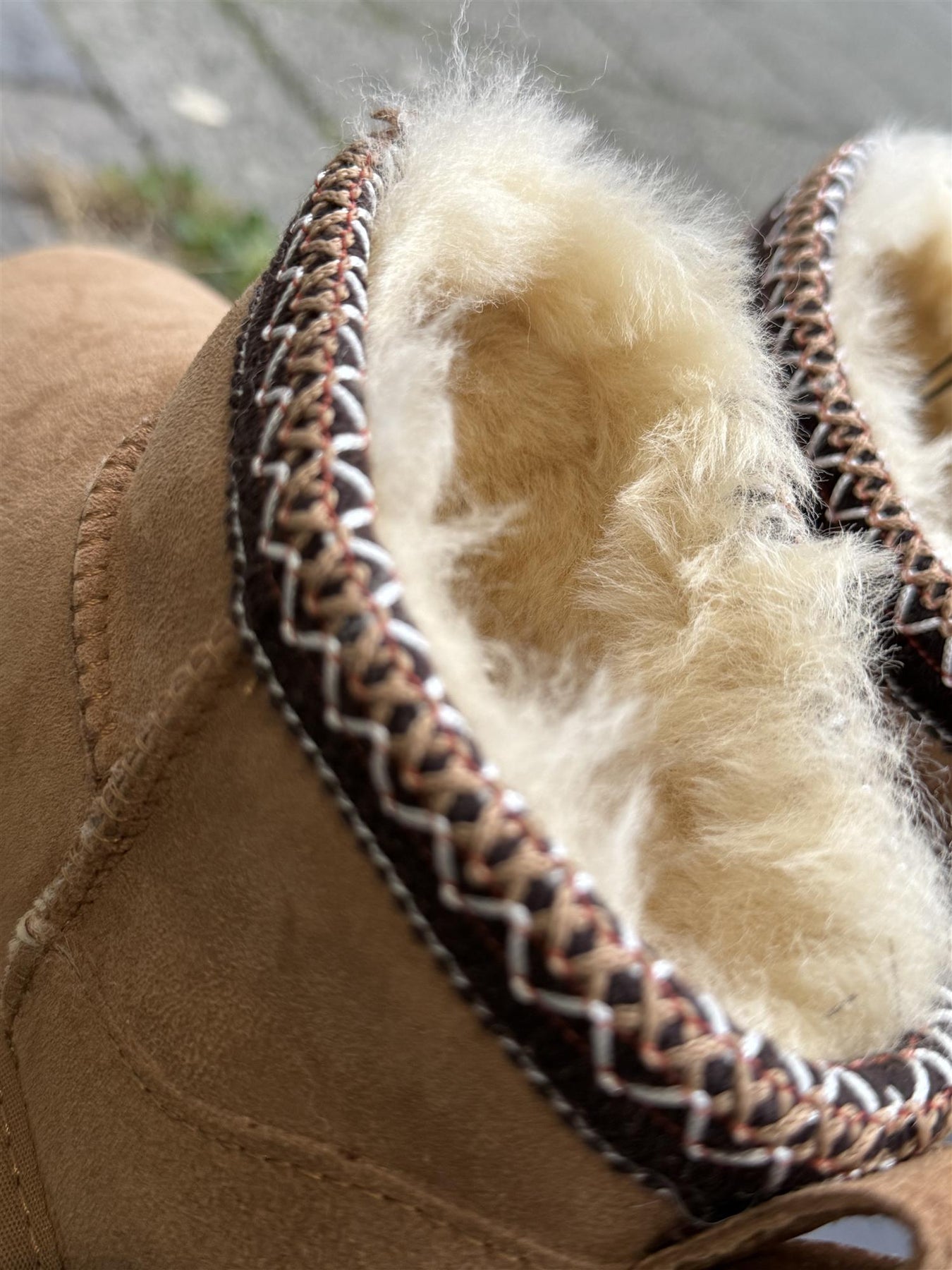 Superpigg saueskinn sko med brodert bånd øverst. God gummisåle.