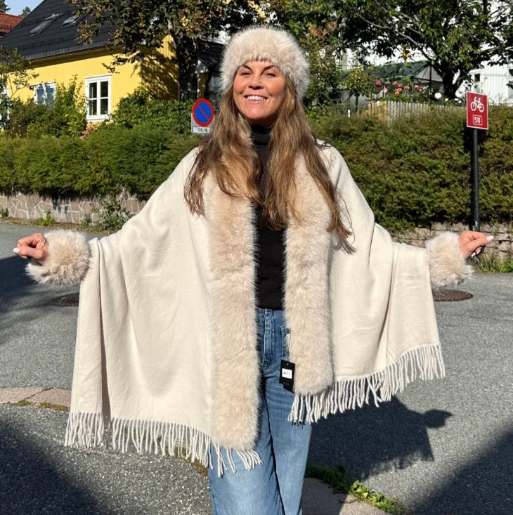 Nydelig ullskjerf med kant av fuskepels på den ene siden. Dette kan knyttes som skjerf i halsen, eller legges over skuldrene som et sjal. 85 x 200 cm.